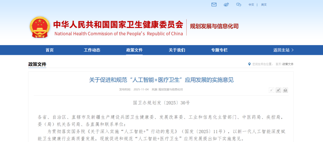 2025年11月4日,为贯彻落实国务院《关于深入实施“人工智能+”行动的意见》(国发〔2025〕11号),以新一代人工智能深度赋能卫生健康行业高质量发展,国家卫生健康委、国家发展改革委、工业和信息化部、国家中医药局、国家疾控局就促进和规范“人工智能+医疗卫生”应用发展提出《关于促进和规范“人工智能+医疗卫生”应用发展的实施意见》(以下简称《意见》)。重点支持人工智能在紧密型县域医共体建设、推动检查检验结果互认、优化患者服务、医院管理等场景的落地,强化数据要素价值释放。到2027年,建立一批卫生健康行业高质量数据集和可信数据空间,形成一批临床专病专科垂直大模型和智能体应用,基层诊疗智能辅助、临床专科专病诊疗智能辅助决策和患者就诊智能服务在医疗卫生机构广泛应用。