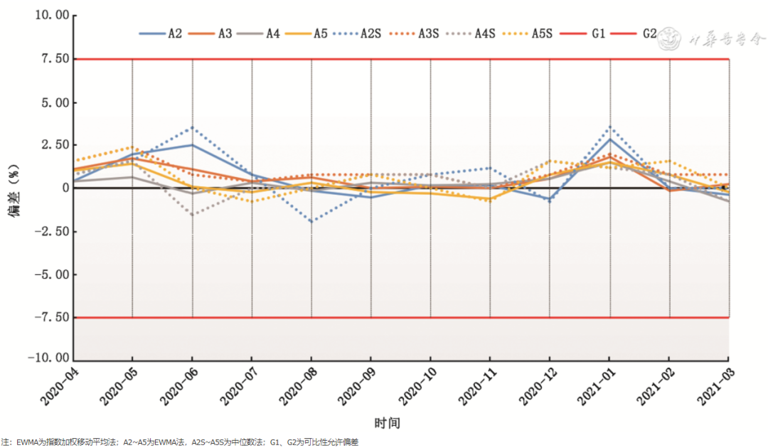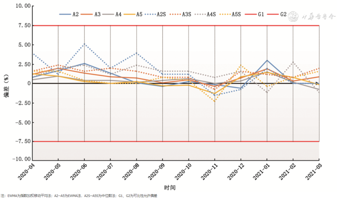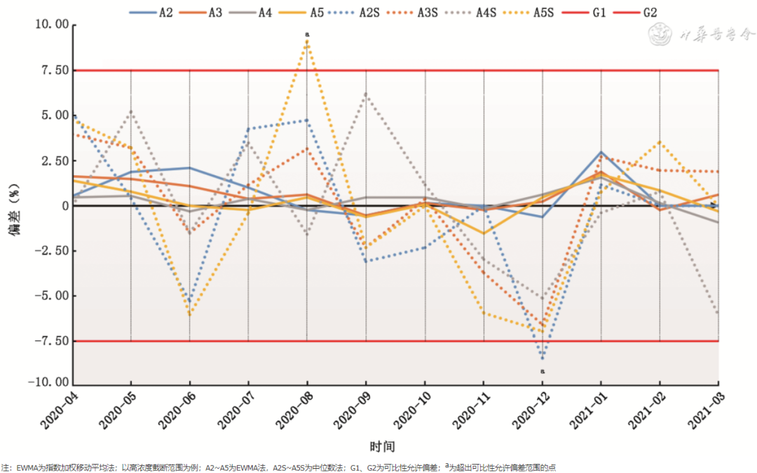 我国卫生行业标准WS/T 641-2018《临床检验定量测定室内质量控制》中指出可以采用患者数据中位数进行实验质量、可比性、稳定性以及变异来源的监测[9]。夏骏等[10]报道了患者数据均值和百分法进行室内质量控制的方案,Goossens等[4]建立了使用患者数据中位数评估和监测实验室间临床检验指标可比性和稳定性的方法。但目前尚未见采用EWMA方法监测实验室内仪器检测结果一致性与可比性的研究报道。
