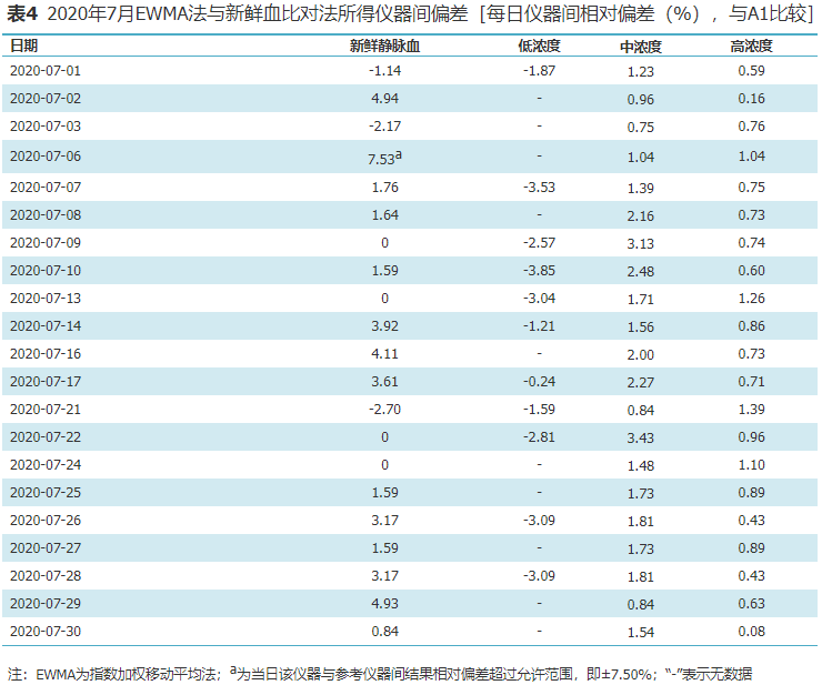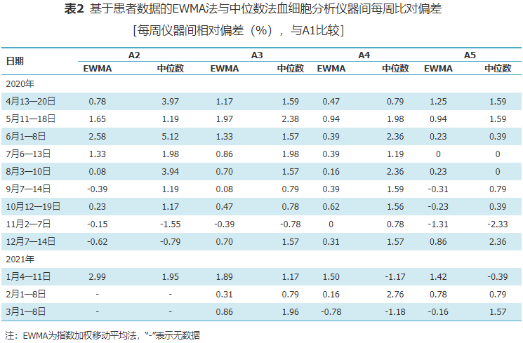 三、EWMA与每日新鲜血比对法仪器间比对结果比较 以A2为例,选取2020年7月患者数据及新鲜血比对数据共21组,采用EWMA法与每日新鲜血比对方法同参考仪器进行每日比对,相对偏差与允许偏差(≤±7.50%)比较。结果显示,EWMA法显示当月该仪器与参考仪器的WBC相对偏差均在允许范围内,然而新鲜血比对结果显示在2020年7月6日,该仪器与参考仪器之间偏差为7.53%,超过了允许范围(表4),比对一致率为95.24%(20/21)。