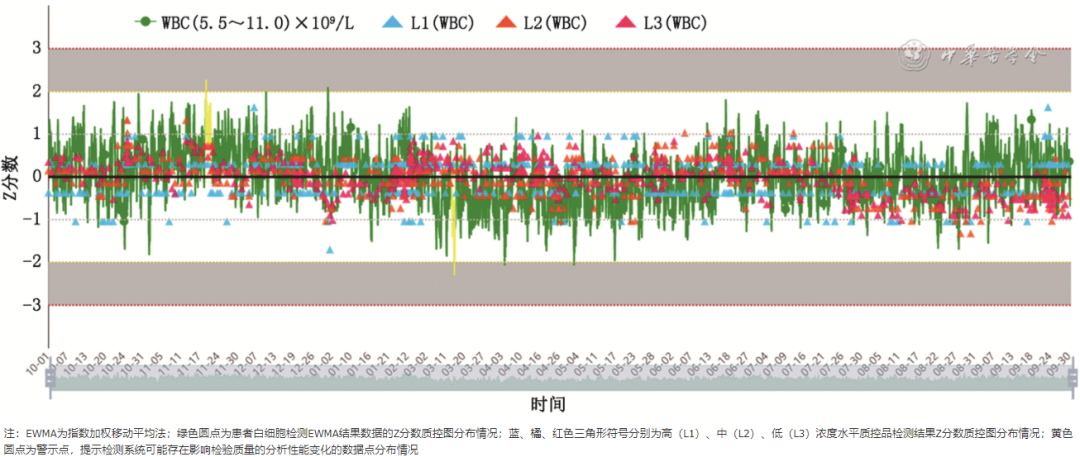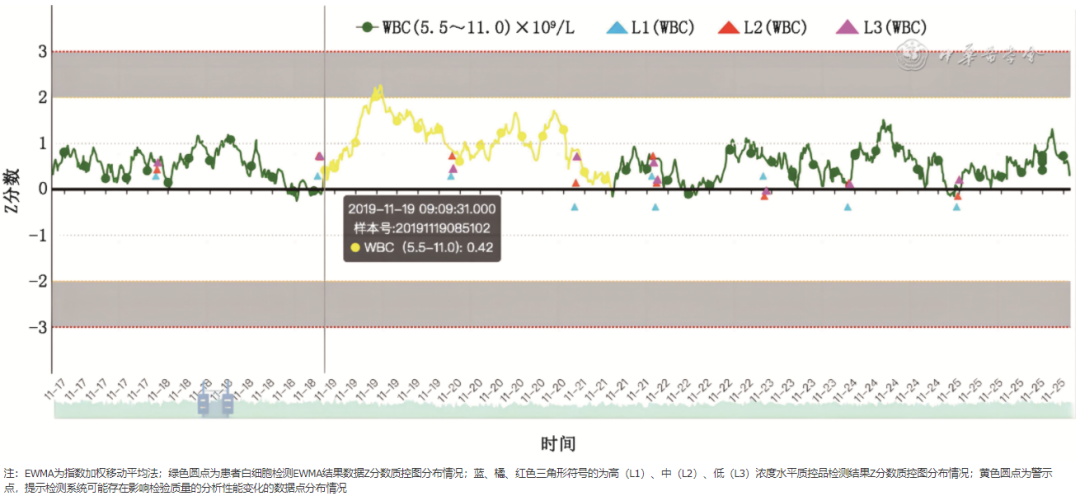 一、最佳EWMA程序的质控效能评价 以参考仪器A1为例,经AI-MA筛选验证,选择儿科实验室WBC参考区间(5.5~11.0)×109/L为质量控制浓度,λ=0.03为加权系数。2019年10月1日—2020年9月30日质控验证中共出现2次预警(图1);其中2019年11月19日9时9分开始白细胞检测结果出现正确度性能的正偏移,质控图出现黄色警告,11月21日纠正(图2);查维护保养记录示11月21日进行了穿刺针更换,确定为穿刺针磨损导致的性能变化;2020年3月15日10时36分WBC检测结果出现正确度性能的负偏移,质控图出现黄色警告,3月17日9时18分纠正,查技术记录显示3月17日该仪器进行了废液室冲洗维护,推测为排废管路轻微堵塞。统计周期共纳入38 313个样本结果,提示出现潜在质量风险的样本数70个,预警率为0.183‰,误差检出概率为100%,假失控概率为0,结果显示EWMA质控参数设置合理,质控效能良好。 图1 XN1000总体患者数据Z分数质控图12个自然月数据集(EWMA法与3个水平质控品,2019年10月1日—2020年9月30日) 图2 XN1000总体患者数据Z分数质控图出现正偏移结果(EWMA法与3个水平质控品,2019年11月17—25日)