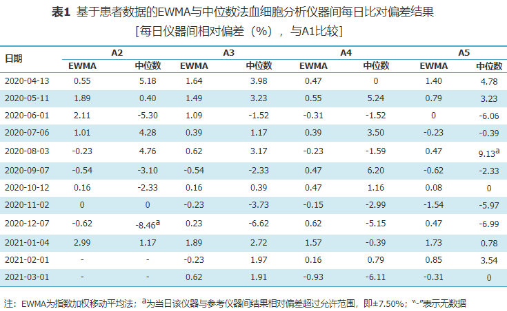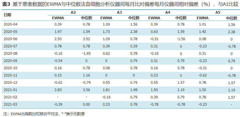 EWMA方法可以连续监测实验室检测系统稳定性,为验证其对检验结果一致性的日间连续监测能力,本文选择了连续1个月数据将其与每日新鲜血样本比对结果进行了比较分析,结果显示采用新鲜血比对方案进行仪器间比对时出现仪器间偏差超过允许范围的情况,2种方法的结果一致率超过95%。本实验室自2016年起,每日质控在控后使用多台仪器检测同一管新鲜静脉血样本,计算仪器间偏差,作为室内质控的补充来辅助监测每日仪器间结果的一致性,应用效果良好。国内很多实验室都采用这种方式进行血细胞分析仪间结果一致性的日常监测或作为室内质控的补充[12],然而每日新鲜血比对方法存在一定的局限性,如每日随机选择1管新鲜血在每台仪器上进行单次检测,可能存在较多不可控因素导致的随机误差,如人为操作、样本放置时间影响等,因而该方案需结合其他血细胞分析项目的比对结果、室内质控及定期比对法共同判断当前仪器的稳定状态。郑翠玲等[2]报道的每日新鲜样本比对辅助室内质控的案例,将每管新鲜血在每台仪器上进行开机后、运行中及关机前进行3次测定,该方案每日仅选择1个参考区间内浓度进行检测,无法覆盖实验室常用检测区间。此外,新鲜血比对均需每日进行样本留取和检测,增加了人力物力成本。本结果提示EWMA可代替每日新鲜静脉血比对,作为室内质控的补充,对实验室内不同血细胞分析仪间结果一致性进行持续有效的监测。