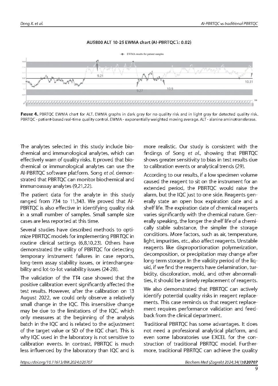 研究提出,近年来,PBRTQC在临床实验室的应用显著增加。由于其固有的优势,例如实时全过程监控和降低成本的潜力,这种方法的采用获得了显著的吸引力。国际临床化学联合会(IFCC)提出了6种PBRTQC算法作为推荐指南。这些算法涵盖了各种统计技术,如移动均值法(MA)、移动中位数法(MM)、指数加权移动均值法 (EWMA)等,实现统一的标准来推进这种复杂的PBRTQC技术是具有挑战性的。根据Badrick等人的观点,引入PBRTQC需要在统计过程中从传统经验转向人工智能,这些研究有助于扩大PBRTQC的潜在应用。因此,需要比较传统PBRTQC和AI-PBRTQC在临床实验室中的适用性。AI-PBRTQC在识别试剂校准、时间校准和试剂品牌更换等质量风险方面展现出更高效能,AI-PBRTQC不仅能够有效监控分析性能,还能通过智能化模型构建,实现更精准的风险预警和质量控制,为临床实验室提供了一种更先进、更灵活的质量管理解决方案。