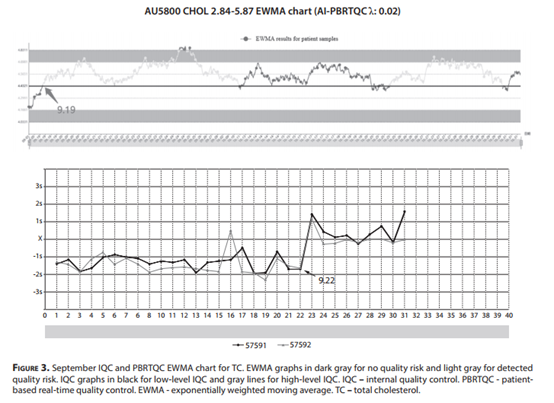 图3:TC九月份IQC和PBRTQC EWMA图,EWMA图中深灰色表示没有质量风险,浅灰色表示检测到质量风险。黑色IQC图表示低浓度水平IQC,灰色线表示高浓度水平IQC,IQC-室内质控,PBRTQC——基于患者数据的实时质量控制,EWMA指数加权移动均值法,TC-总胆固醇。