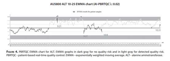 图4:ALT PBRTQC EWMA图。EWMA图以深灰色表示无质量风险, 浅灰色表示检测到质量风险。PBRTQC—基于患者数据的实时质量控制,EWMA指数加权移动均值法,ALT -丙氨酸转氨酶。