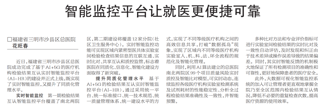 健康报聚焦三明|检验结果互认智能化建设新突破 2025-02-12 436 健康报|三明市沙县区总医院紧密型医共体同质化、信息化、智能化建设新突破2025年2月11日,健康报“数智健康”版块刊登文章《智能监控平台让就医更便捷可靠》,介绍了福建省三明市沙县区总医院在紧密型医共体结果互认实时智能平台建设的创新实践,该院院领导及其领导团队展现了卓越的创新精神,积极推动紧密型医共体结果互认同质化、信息化与智能化建设,不仅实现了医疗资源共享和医疗服务质量的提升,还确保了患者就医的便捷性和可靠性。这一里程碑式的进展也证实了三明市沙县区总医院在响应国家卫生健康委员会2025年为民服务八件实事政策方面率先迈出了坚实的一步,践行“人民至上、敢为人先”的医改先锋精神。为全国其他医疗机构提供了宝贵的借鉴经验,彰显了在新时代背景下,医疗行业领导者应有的担当与远见。实时智能监控作为全国医改的先锋、三明医改的核心力量,近日,三明市沙县区总医院再次树立了典范,成功完成了紧密型医共体森栩医学基于AI+5G的医疗机构检验结果互认实时智能监控平台(AI-HR)第一期建设并正式上线。第一期检验结果互认实时智能监控平台覆盖沙县区总医院南北两院区99个项目互认,第二期建设将覆盖12家分院(社区卫生服务中心),可实现区域内紧密型医共体实验室间检验检查结果信息的互联互通、实时比对、共享互认和质控监管,标志着医院在同质化、信息化、智能化建设方面取得了新突破。此次检验结果互认实时智能监控平台的上线,是沙县区总医院进一步贯彻落实国家、省、市关于推进医疗机构检查检验结果互认工作的要求,为实现高质量高标准的检验结果互认提供了坚实的技术保障。提升同质化管理水平 基于AI+5G的检验结果互认实时智能监控平台(AI-HR)通过采用统一平台、统一标准接口、统一技术规范、统一质量管理体系、统一建设水平的方式,实现不同等级医疗机构之间的高效信息共享,打破数据孤岛现象,实现了区域内不同等级医疗机构实验室人、机、料、法、环全流程全6+过程的规范化管理及智能管理,确保了各级医疗机构检验能力同质化管理水平;利用AI算法,建立总医院南北两院区99个项目、968个基于AI的PBRTQC质量风险实时质控及智能比对模型,可实时动态,连续监控各级医疗机构实验室检测系统及试剂耗材的性能稳定性、分析全过程检验结果准确性及一致性,并智能预警;多种比对方法和专业评价指标,可进行实验室间检验结果的实时比对及一致性自动评估,及时发现及纠正由于技术差异或操作误差导致的结果偏差,实时智能反馈的机制极大地保证了所有检测项目的准确性和可靠性,有效保障患者医疗安全;此外,大数据可视化智能监控系统的加入,则让管理者可以更直观地掌握全院乃至全区范围内检验结果互认情况,降低不必要的重复检查次数,提高医疗资源的使用效率,减轻了患者的经济负担和时间成本。AI-HR森栩医学提供专业领先的检验结果互认整体解决方案森栩医学AI-HR平台:森栩医学基于AI+5G的医疗机构检验结果互认实时智能监控平台(AI-HR)符合国家卫健委医疗机构检验结果互认最新管理办法信息化建设目标及同质化要求,基于AI+5G创新技术开发,优于国际不同医疗机构临床实验室间检验结果一致性评价方法及信息化工具功能,为推进区域内智慧医联体检验结果互认提供信息化智能化管理平台与工具。高度契合国家政策的信息化建设及质量管理要求森栩医学AI-HR平台高度契合国家卫健委医疗机构检验结果互认最新管理办法及《2025年全系统为民服务八件实事》有关结果互认工作的信息化建设目标及质量控制要求。严格遵循国内外多项指南和行业标准要求严格遵循国内外多项指南和行业标准开发,包括国家卫健委WS/T641-2018临床实验室室内质控指南、WS/415-2024室间质量评价指南及ISO15189:2022国际准则等,确保其在质量管理的专业性和可靠性。推动信息互联互通,优化资源配置森栩医学AI-HR平台促进了跨区域、跨医疗机构的信息互联互通及互认,避免了重复检查,显著提高了医疗资源的利用效率。灵活选择多种比对方法和评价指标,平台能够进行精准的实验室间比对及结果一致性评价,确保了不同医疗机构检验结果的准确性和一致性,直接降低了患者的医疗成本。这不仅符合国家政策对于资源共享和优化配置的要求,也大大增强了医疗服务的可及性和公平性。构建智慧检验新生态,实现高质量检验结果互认应用AI+5G、医学大数据挖掘等创新技术,依据临床实验室国际高标准质量管理要求建设,建设内容包括室内质控、室间质量评价管理系统、患者数据智能实时质控及比对系统AI-PBRTQC、全实验室检验结果自动审核系统LIVS、临床实验室试剂耗材智能管理系统RIMS、ISO15189智能质量管理系统、大数据可视化智能监控系统、临床实验室质量指标智能监控系统等。提升同质化管理水平通过采用统一平台、统一标准接口、统一技术规范、统一建立质量管理体系、统一建设水平的方式,实现了不同等级医疗机构之间的高效信息共享,打破数据孤岛现象,实现了区域内不同等级医疗机构实验室人、机、料、法、环全流程全过程的规范化、标准化管理及智能管理,确保了各级医疗机构检验能力同质化管理水平。患者数据智能实时质控及