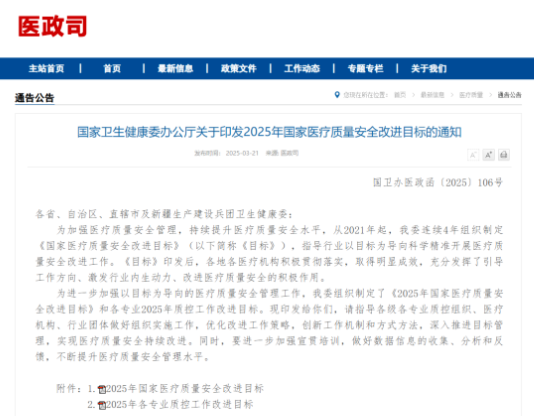 国家卫生健康委自2021年起,每年发布年度国家医疗质量安全改进目标和各专业质控工作改进目标。《2025年国家医疗质量安全改进目标》是根据《全面提升医疗质量行动计划(2023-2025年)》《关于进一步推进医疗机构检查检验结果互认的指导意见》等文件要求,结合2024年目标改进情况和变化趋势以及年度医疗质量安全监测数据情况而形成。